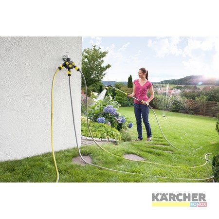Aynı anda üç taneye kadar hortum ile sulamak için G1 musluk konektörlü ve G3/4 çap düşürücü parçalı yüksek kaliteli 4 yollu dağıtıcı. 3 yollu dağıtıcının üç bağımsız kumandalı üç musluk konektörü bulunmaktadır ve optimum debi sağlar. Tüm standart bahçe hortumları ile birlikte üniversal olarak kullanılabilir ve sağlam kalitesi ve konforlu ve basit tutuş için ergonomik tasarımı ile etkileyicidir. Sağlam iç dişlere sahip akıcı çalışan birleşim eklemi musluğa basit ve kolay bağlantıyı garanti eder. 3 yollu dağıtıcı çoğu click sistemi ile uyumludur.