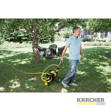 Aksesuar tutucusu ve saklama kancası ile taşınabilir hortum taşıyıcı. Yüksekliği ayarlanabilir tutamak, hortumun dolaşmasını engellemek için açılı hortum konektörleri, serbest döner kol, yenilikçi katlama özelliği ile ve yer tasarruflu depolama. Tamamen monte edilmiş.