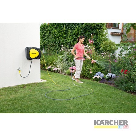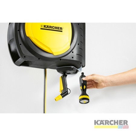 Akıcı otomatik hortum sarma ve açma sağlayan Premium hortum kutusu CR 7.220 hortum sarıcı, 0° – 180° arası dönebilir, ayarlanabilir döner durdurucu ve düz, yerden tasarruf eden duvar braketi.