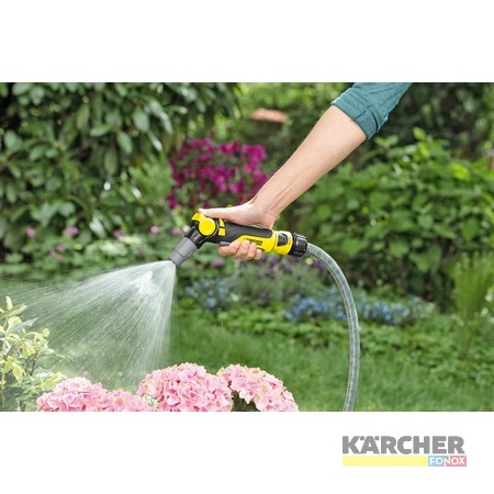 Bu kolaylıklar sadece Kärcher tarafından sunulmaktadır: Tetiğin yerleşmesine uygun olan dönebilen tutacak öne ve arkaya çevrilebilir, ele rahatça oturur ve bireysel kullanımlarda rahatlık sağlar. Bu tutacak ayrıca, ilave koruma sunan yumuşak plastikten oluşmaktadır. Tek elle kullanılabilen kontrol valfi sayesinde su akışı ihtiyaca göre adapte edilebilir. Püskürtme tabancası 2 püskürtme modu sunmaktadır: noktalı püskürtme ve konik püskürtme. Bunlar, ihtiyaçlara göre ayarlanabilirler. Örneğin, çiçek ve bitki saksılarının sulanması veya terasta ve bahçe mobilyalarında yer alan kaba kirlerin temizlenmesi gibi. Sonuç olarak: Kärcher’e ait başlıklar bütün bağlantı sistemleriyle uyumlu olup herhangi bir probleme neden olmaksızın bahçe hortumunuza bağlanabilirler.