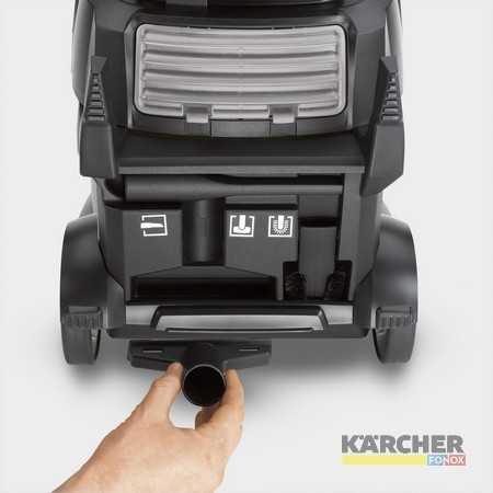 Aksesuarlar (döşeme aparatı, detay aparatı, kalorifer fırçası) ayrı ayrı kolay çıkarılabilen bir şekilde doğrudan makinenin üzerine entegre edilmiştir. Bu özellik kullanıcıya temizliğin farklı uygulamalarında ihtiyacı olan esnekliği sağlar. T 15/1'in arkasındaki emiş hortumu yuvası makinenin taşıma ya da saklama sırasında doğru pozisyonda muhafaza edilebilme imkanı sunar. Emiş hortumunun makine gövdesine önden ve alttan sabitlenebildiği iki park pozisyonu bulunmaktadır. 2 arka kanca sayesinde makine temizlik arabalarına rahatlıkla yerleştirilebilir. Emiş tüpü park pozisyonunda makinenin altından sabitlenir ve kolaylıkla erişilebilir şekilde yerleştirilir. Yeni, yüksek kalite elektrik kablosu çok güçlüdür ve yırtılmaz. Aşınma, bozulma, darbeler ya da termal değişikliklere karşı dayanıklıdır. Dirençli kablo kaplaması oldukça elastik ve neredeyse tahrip edilemez bir madde olan poliüretandan (PUR) imal edilmiştir. 2 ön yön tekeri ve 2 arka tekerleği ile sağlam şasi geriye doğru yapılan ani hareket ve dönüşlere imkan sağlamaktadır. Mobilyalar ve makine tüm gövdeyi çevreleyen darbeye dayanıklı tampon kenar sayesinde korunmaktadır.